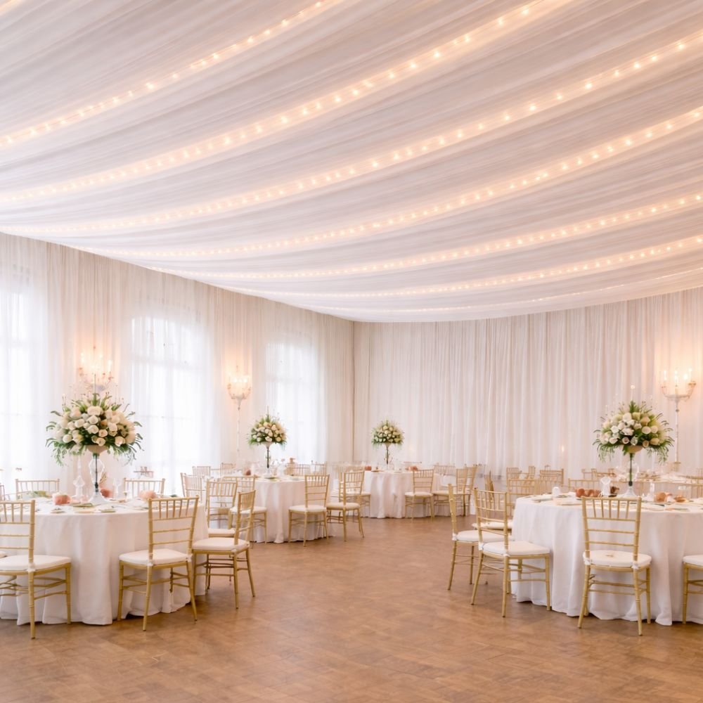We use high-quality, lightweight fabric that drapes smoothly without sagging. This ensures a neat and elegant ceiling finish throughout the event duration. - Custom Color Options